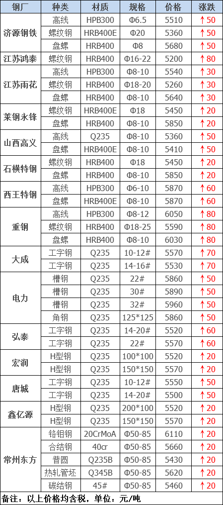 據(jù)數(shù)據(jù)監(jiān)測,今日共20家鋼廠調(diào)價,其中漲幅最高為江蘇鴻泰螺紋鋼,調(diào)價幅度80元/噸,具體調(diào)價明細(xì)如下: 鋼廠調(diào)價 福海鑫建材價格平穩(wěn) 南鋼螺紋鋼上調(diào)30元/噸 江蘇雨花建材上調(diào)30元/噸 濟(jì)源鋼鐵建材上調(diào)50元/噸 西王特鋼建材上調(diào)60元/噸 江蘇鴻泰螺紋鋼上調(diào)80元/噸 山西高義建材價格上調(diào)50元/噸 萊鋼永鋒建材價格上調(diào)20元/噸 石橫特鋼建材價格上調(diào)20元/噸 山東傳洋型材價格平穩(wěn) 電力角鋼上調(diào)50元/噸 電力槽鋼上調(diào)50元/噸 宏潤H型鋼上調(diào)20元/噸 弘泰工字鋼上調(diào)60元/噸 大成工字鋼上調(diào)70元/噸 唐城工字鋼上調(diào)50元/噸 鑫億源H型鋼上調(diào)20元/噸 天鋼板材價格平穩(wěn) 普陽中厚板價格平穩(wěn) 常州東方優(yōu)鋼上調(diào)20元/噸 鋼廠調(diào)價占比 上調(diào)16家,占比80%,調(diào)價幅度20-80元/噸。 平穩(wěn)4家,占比20%。 價格簡評 今日鋼廠出廠指導(dǎo)價總體偏強(qiáng),期螺震蕩運行。宏觀經(jīng)濟(jì)金融數(shù)據(jù)的穩(wěn)中向好,對于基本面的向好有足夠支撐。庫存方面,社庫小漲,廠庫降,總庫存下降,終端需求在淡季依然保持了韌性。綜上,在降準(zhǔn)、限產(chǎn)等消息面刺激下,預(yù)計短期鋼廠價格仍將走高。