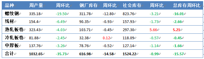 本周五大品種產量下降35.73萬噸,庫存小幅走低,較上周下降15.57萬噸,主要來自螺紋鋼降庫。但從表觀需求來看,五大品種需求均呈現回落。說明本周庫存下降主要來自產量下降所致,目前鋼材市場仍表現為供需雙弱的格局。鋼價波動相對有限,難以形成單邊走勢。