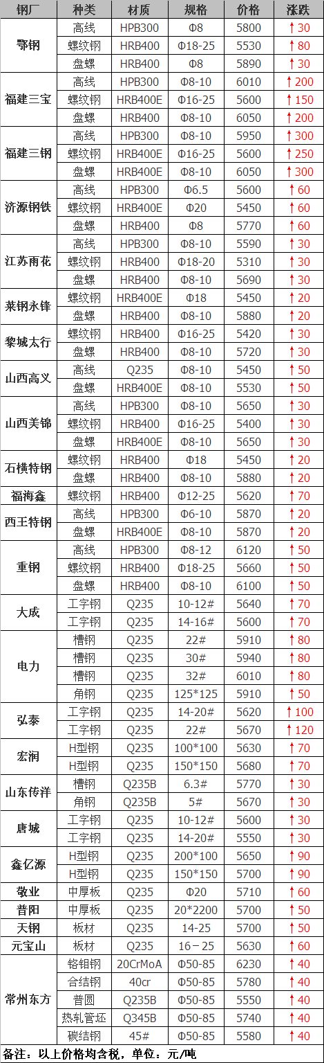據數據監測,今日共25家鋼廠調價,其中漲幅最高為三鋼盤線,調價幅度300元/噸,具體調價明細如下: 鋼廠調價 鄂鋼建材上調30-80元/噸 西王特鋼建材上調20元/噸 江蘇雨花建材上調30元/噸 黎城太行建材上調30元/噸 山西美錦建材上調30元/噸 石橫特鋼建材上調20元/噸 萊鋼永鋒建材上調20元/噸 福海鑫螺紋鋼上調70元/噸 濟源鋼鐵建材上調60元/噸 山西高義建材上調50元/噸 福建三寶建材上調150-200元/噸 福建三鋼建材上調250-300元/噸 電力型材上調80元/噸 宏潤H型鋼上調70元/噸 唐城工字鋼上調30元/噸 大成工字鋼上調70元/噸 山東傳洋型材上調30元/噸 鑫億源H型鋼上調90元/噸 山東傳洋型材上調40-70元/噸 弘泰工字鋼上調100-120元/噸 天鋼板材上調50元/噸 普陽中厚板價格上調50元/噸 敬業中厚板價格上調60元/噸 元寶山板材價格調上調60元/噸 常州東方優鋼上調40元/噸 鋼廠調價占比 上調25家,占比100%,調價幅度20-300元/噸。