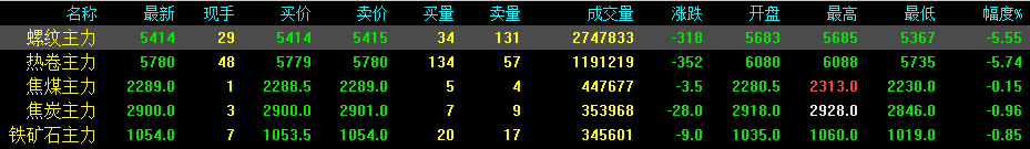今日螺紋主力期貨收盤價5414,跌318點(diǎn),跌幅5.55%;熱卷主力期貨收盤價5780,跌352點(diǎn),跌幅5.74%;鐵礦石期貨收盤價1054.0,跌9點(diǎn),跌幅為0.85%。