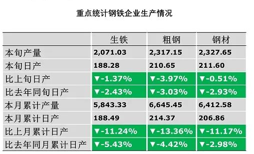 最新的產存數據顯示,本周鋼材總產量自五個半月低位微增0.36萬噸至1007.2萬噸,鋼材品種總庫存增加20.98萬噸或0.98%至2157.99萬噸,止步3連降,意味著周消費量繼續下降24.81萬噸。而供給方面,7月下旬重點鋼企粗鋼日均產量旬環比大降3.98%至210.65萬噸,創13個月新低,在連續15個月的同比正增長之后終于轉負。