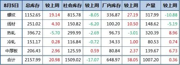 本周全國五大主要鋼材品種總庫存增加20.98萬噸或0.98%至2157.99萬噸,止步3連降,其中社會庫存再度轉降17.07萬噸,鋼廠庫存則大增38.05萬噸。