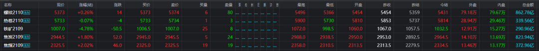今日期鋼沖高回落,低位震蕩,期螺下跌52收報5379,期卷下跌42收報5772,焦炭上漲15.5收報2980,鐵礦石下跌29.5收報1003,焦煤上漲40收報2374.5。