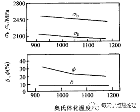 奧氏體化溫度對低溫形變淬火效果的影響與鋼的化學成分有很大關系。一般規律是奧氏體化溫度越低,形變淬火后抗拉強度越高,斷面收縮率越大,而延伸率基本保持不變。見圖2、圖3。