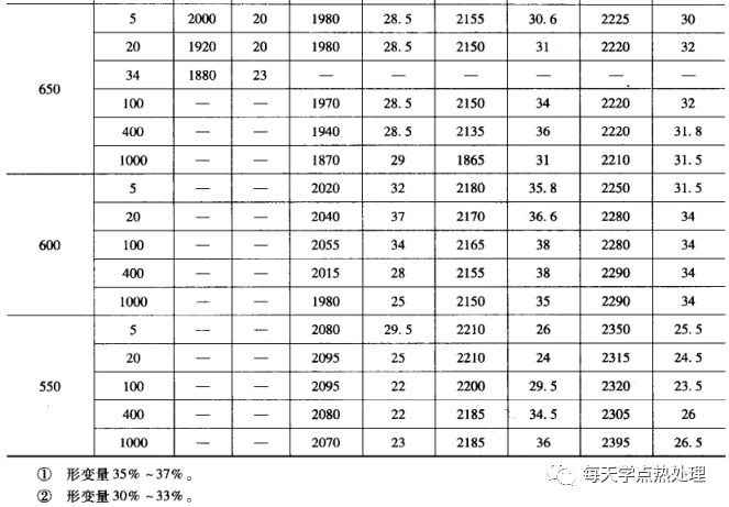 為了獲得理想的強化效果,低溫形變淬火時的形變量應達到60%以上。在一般低溫形變條件下,一次得到如此大的形變量比較困難。但許多研究結果發現,多次形變的累積與一次形變達到要求量得到的效果幾乎沒有差異。實驗結果見表1、表2。