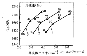 低溫形變可使馬氏體組織細化。在一定奧氏體化溫度下,形變量越大,馬氏體越細,鋼的屈服強度越高。圖10,表示出了馬氏體尺寸與屈服強度的關系。