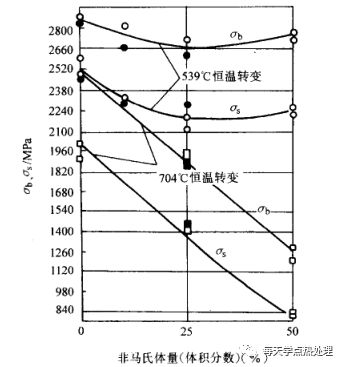 形變后是否需要立即淬火,取決于過冷奧氏體的穩定程度。如果過冷奧氏體足夠穩定,不產生非馬氏體組織,形變后的保溫和加熱對強化效果影響不大,有時甚至有好的作用(前已敘述)。當過冷奧氏體形變中或形變后部分分解成珠光體組織時,則強化效果明顯下降,分解成貝氏體時,強化效果下降幅度小。圖9,表示了非馬氏體組織含量對低溫形變后拉伸性能的影響。