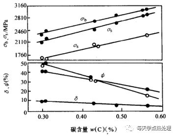鋼材化學成分不同,低溫形變淬火強化效果也不同。影響強化效果的元素是碳。C在0.3%-0.6%(wt)范圍內,低溫形變淬火后的強度隨含碳量的增加呈直線上升趨勢,延伸率下降不大,斷面收縮率下降稍快。見圖11。