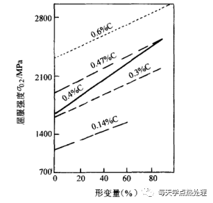 鋼材形變淬火后的屈服強度隨形變量的增加而增大,隨含碳量的增加,強化效果更加顯著。詳見圖12、圖13、圖14。