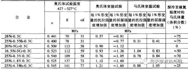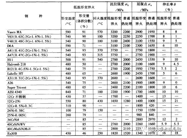 a. 拉伸性能。一般情況下,低溫形變淬火比普通淬火能提高強度300-700MPa。表6,列出了一些鋼的低溫形變淬火鋼的拉伸性能數據。