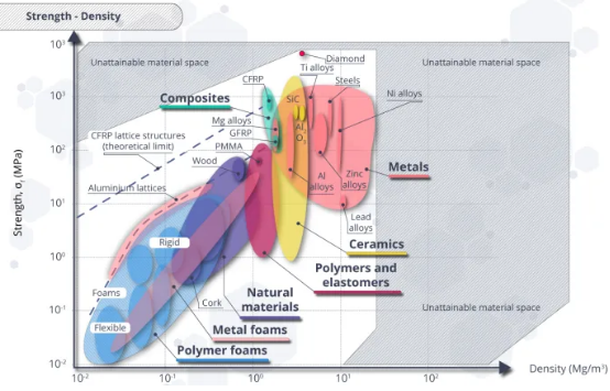 不同材料和材料類別的強度與密度