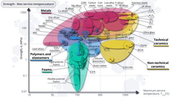 不同材料和材料類別的強度與最高使用溫度的關系