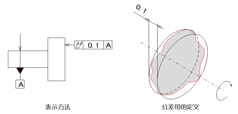 ▲圖例說(shuō)明2:公差帶是在與基準(zhǔn)同軸的任一半徑位置的測(cè)量圓柱面上距離為0.1mm的兩個(gè)圓之間的區(qū)域。